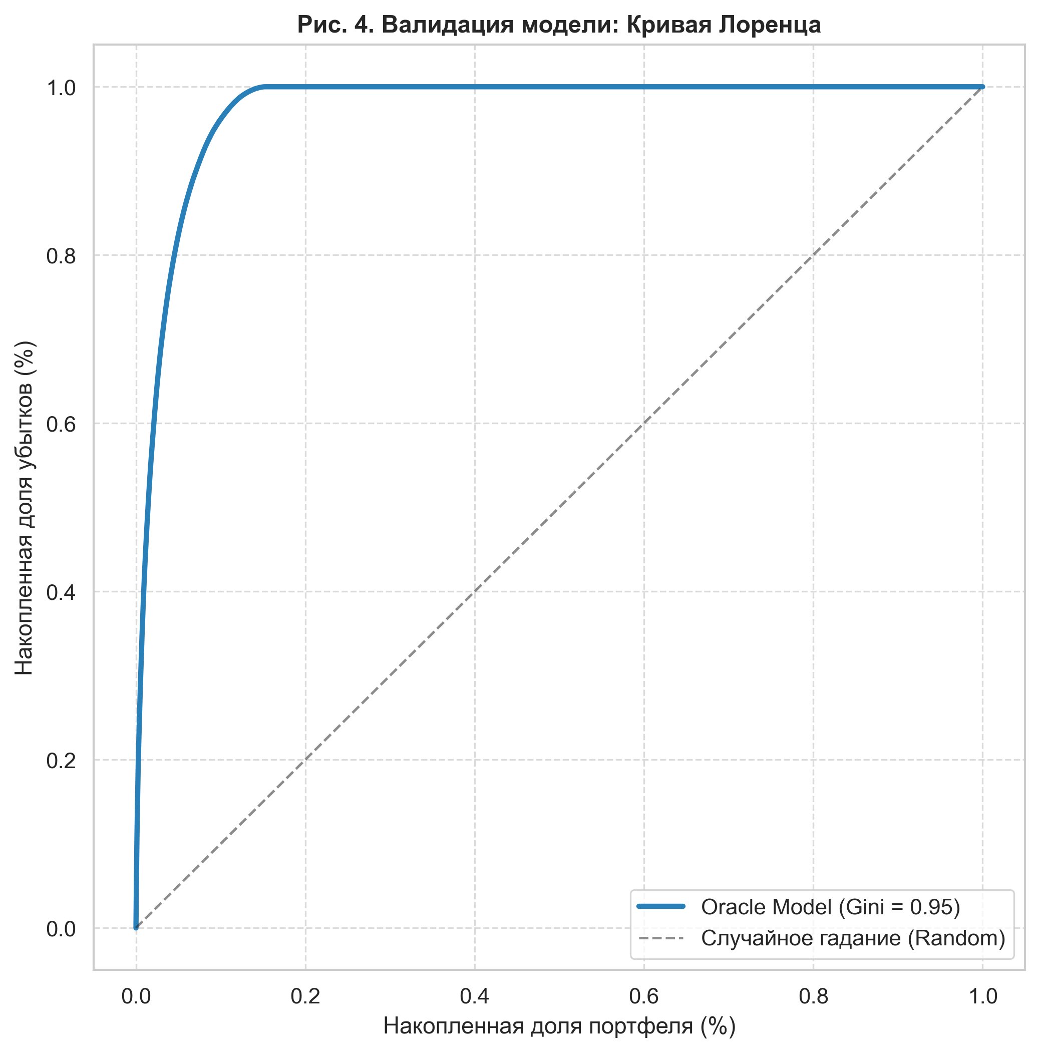 The calculated Gini value for the Oracle (0.95) indicates a high discriminatory power of the model and confirms that the synthetic dataset reproduces the risk structure with "heavy tails" characteristic of real economic systems.
